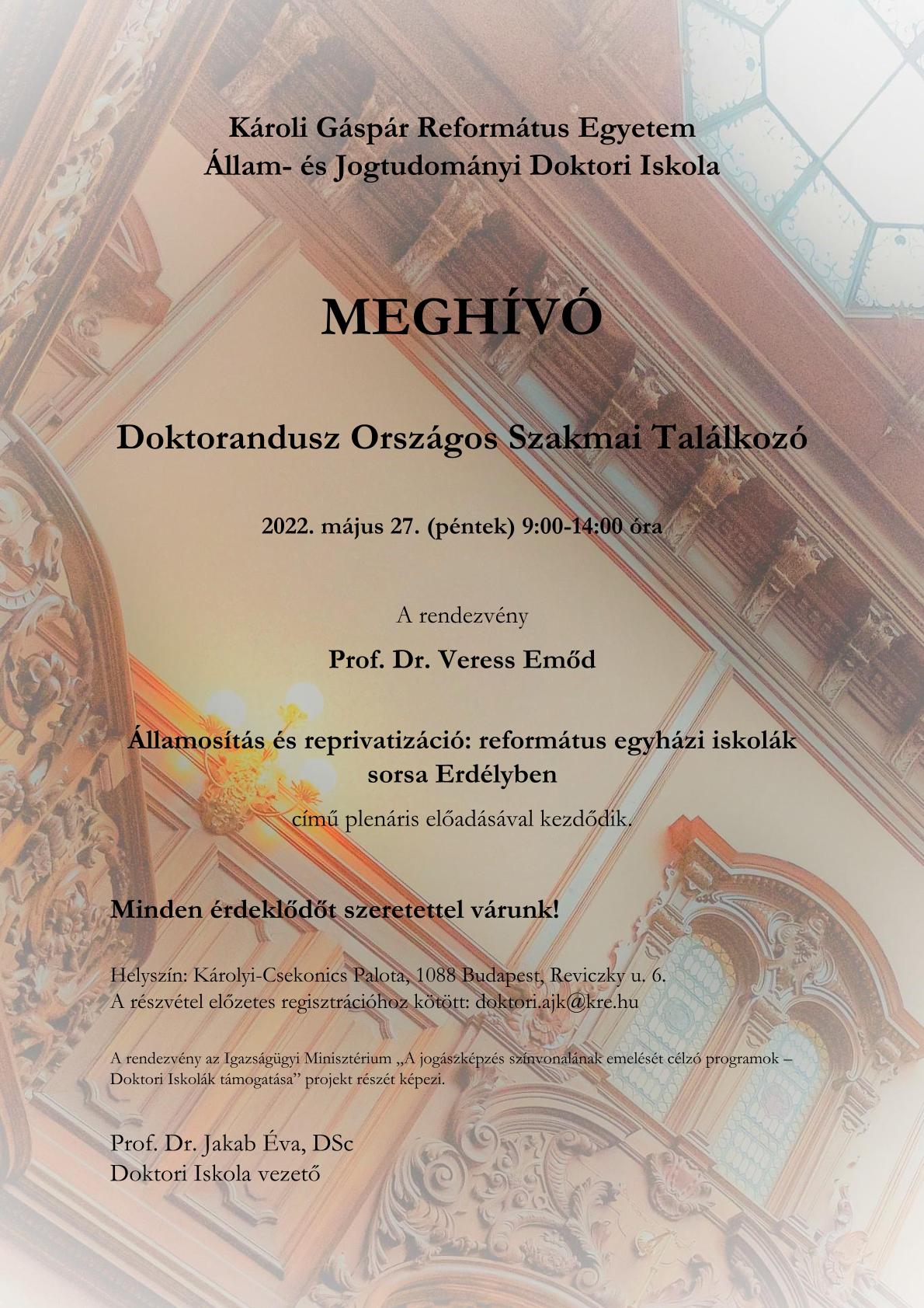 A Károli Gáspár Református Egyetem Állam- és Jogtudományi Doktori Iskola Doktorandusz Országos Szakmai Találkozót rendez. Rendezvényünk lehetőséget biztosít a doktoranduszoknak legfrissebb kutatási eredményeik bemutatására. Plenáris előadást tart Prof. Dr. Veress Emőd Államosítás és reprivatizáció: református egyházi iskolák sorsa Erdélyben címmel.