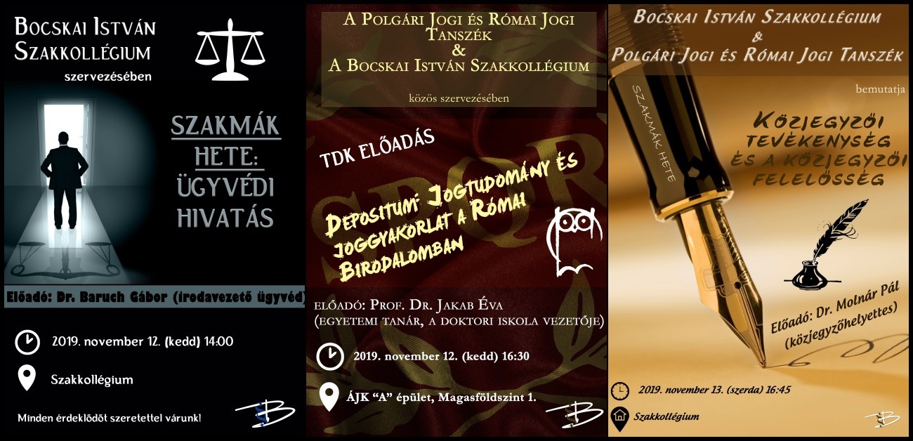 A Bocskai István Szakkollégium megrendezésében folytatódik a ’Szakmák hete’ programsorozatunk, melynek keretében a jogász hivatásrendekkel ismerkedhetnek meg a hozzánk ellátogatók. Ezenkívül izgalmas TDK előadásokkal is készülünk Nektek.